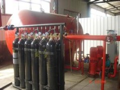 消防氣體頂壓給水設(shè)備中消防氣壓水罐是儲(chǔ)水部件,其有效水容積最低要求3m3。氣壓水罐均采用補(bǔ)氣型氣壓水罐。該類(lèi)設(shè)備靠大型氣壓水罐提供10min消防初期用水量,不設(shè)消防泵組,只設(shè)有消防穩(wěn)壓泵組。主要不同在于氣體頂壓設(shè)備采用高壓氣瓶組儲(chǔ)存消防工作時(shí)的動(dòng)力氣源,動(dòng)力氣源與氣壓水罐分置,當(dāng)消防指令到達(dá),啟動(dòng)頂壓系統(tǒng)向氣壓水罐輸入滿(mǎn)足消防工作壓力的壓縮氣體,將罐內(nèi)消防用水置換排出,消防用水以恒壓狀態(tài)供給消防部件。
