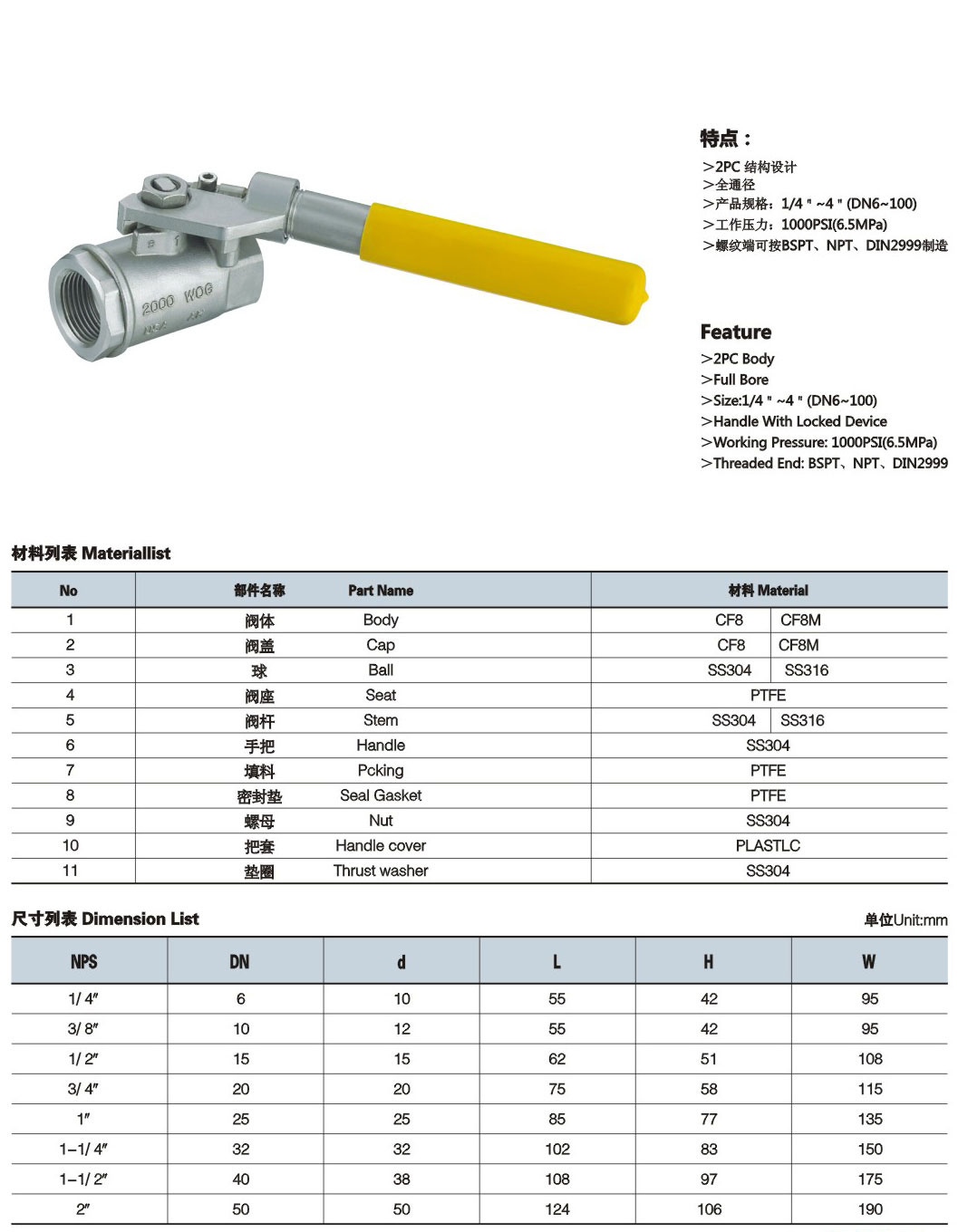 彈簧式自動歸位球閥概述: 彈簧式自動歸位球閥適用于PN1.0~4.0MPa,工作溫度-29~180℃(密封圈為增強聚四氟乙烯)或-29~300℃(密封圈為對位聚苯)的各種管路上,用于截斷或接通管路中的介質。 彈簧式自動歸位球閥適用范圍: 彈簧式自動歸位球閥在應用上選用不同的材質,可分別適用于水、蒸汽、油品、硝酸、醋酸、氣及某些腐蝕性液體(W。O。G)等多種介質。螺紋類型:G。NPT。BSPT。BSP。DI259/2999 彈簧式自動歸位球閥產品特點: 內螺紋連接球閥及對焊連接球閥分為整體式(一片式)、兩段式及三段式。閥體鑄造采用臺灣引進的先進工藝,結構合理、造型美觀。閥座采用彈性密封結構,密封可靠,啟閉輕松。 閥桿采用有倒密封的下裝式結構,閥腔異常升壓時,閥桿不會被沖出。二片式、三片式球閥連接形式另有對焊(BW)承插焊(SW),并均可帶國際標準ISO支架平臺和鎖定裝置??稍O置90°開關定位機構,根據需要加鎖以防止誤操作,驅動方式:手動、電動、氣動。 |