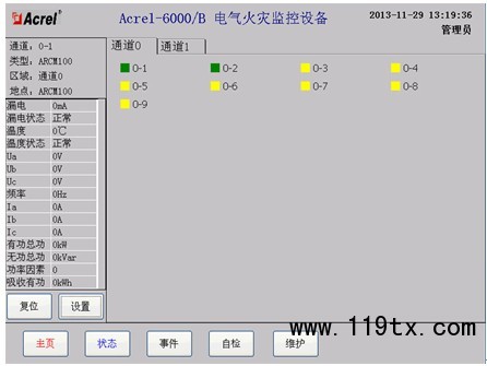 現(xiàn)場(chǎng)ARCM300電氣火災(zāi)探測(cè)器采集數(shù)據(jù)上傳到本界面,客戶(hù)可根據(jù)需要對(duì)回路名稱(chēng)進(jìn)行修改,方格內(nèi)可以顯示相應(yīng)柜子剩余電流實(shí)時(shí)值,數(shù)據(jù)可周期性更新。當(dāng)剩余電流實(shí)測(cè)值大于報(bào)警設(shè)置時(shí),系統(tǒng)報(bào)警狀態(tài)指示燈會(huì)自動(dòng)閃爍。界面下端的報(bào)警提示滾動(dòng)條會(huì)自動(dòng)提示報(bào)警回路名稱(chēng),方便運(yùn)行人員檢查處理故障。