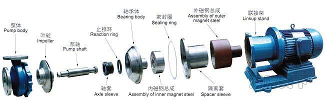 CQB磁力驅動離心泵(簡稱磁力泵),通常由電動機,磁力偶合器和耐腐蝕離心泵組成。其主要特點是利用磁力偶合器傳遞動力,完全無泄漏,當電動機帶動磁力偶合器的外磁鋼旋轉時,磁力線穿過問隙和隔離套,作用于內磁鋼上,使泵轉子與電動機同步旋轉,無機械接觸地傳遞扭矩。在泵軸的動力輸入端,由于液體被封閉在靜止的隔離套內,沒有動密封因而完全無泄漏。