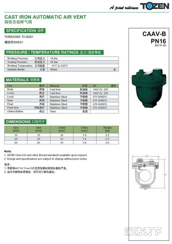 TOZEN CDAV-B鑄鐵自動排氣閥用在供暖系統上如暖氣片、地板采暖、鍋爐系統中排除系統空氣的一種功能性閥門,經常安裝在系統的最高點,或者直接跟分水器、暖氣片一起配套使用。主要是為排除內部空氣,使暖氣片內充滿暖水,保證房間溫度。
