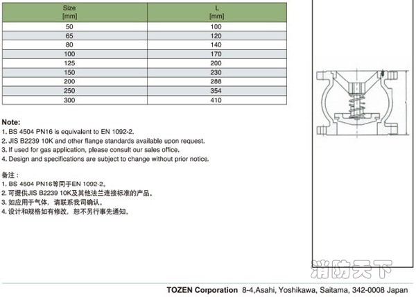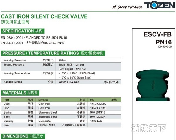 TOZEN ESCV-WB消聲止回閥 這種閥門是自動工作的,在一個方向流動的流體壓力作用下,閥瓣打開;流體反方向流動時,由流體壓力和閥瓣的自重合閥瓣作用于閥座,從而切斷流動。不宜用于含有固體顆粒和粘度較大的介質。當介質按規定方向流動時,閥瓣受介質力的作用,被開啟;介質逆流時,因閥瓣自重和閥瓣受介質反向力的作用,使閥瓣與閥座的密封面密合而關閉,達到阻止介質逆流的目的。