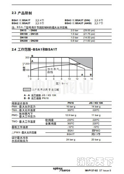 英國斯派莎克波紋管截止閥,BSA2T波紋管蒸汽截止閥的BSA系列波紋管密封截止閥采用獨特的波紋管密封設(shè)計,從而完全消除了閥桿填料密封泄漏的問題,滿足最嚴(yán)格的泄漏等級要求。斯派莎克SpiraxSarco截止閥BSA型截止閥的零泄漏特性改善了設(shè)備的安全性,節(jié)約大量能源,減少了維修費用,并為工業(yè)應(yīng)用提供了清潔安全的工作環(huán)境。斯派莎克SpiraxSarco截止閥BSA型波紋管密封截止閥的口徑從DN15-DN250,可提供各種不同的材質(zhì),從鑄鐵材質(zhì)的BSA1,球墨鑄鐵的BSA2和鑄鋼材質(zhì)的BSA3型截止閥連接標(biāo)準(zhǔn)有法蘭,螺紋和承插焊接等,壓力等級可達(dá)PN40,ANSI 300和CLASS 800。最高工作溫度可425C°,英國斯派莎克SpiraxSarco截止閥可用于高溫系統(tǒng).從而用一種閥即可滿足各種不同的工業(yè)應(yīng)用要求,并確保長的使用壽命,免維修及堅固結(jié)實。