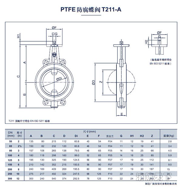 德國EBRO T211-A襯氟對夾式蝶閥結構尺寸: