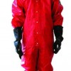 2、將防護頭罩的紅色松緊脖套拉開,佩戴者頭部伸進,使用鼻子和口部對準橡膠口罩。