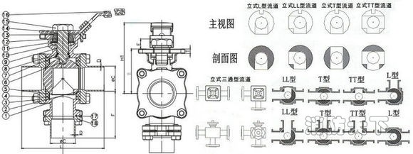 L型流道的三通4面閥座球閥,采用2面閥座,受力平衡,保證閉止通道上可靠密封。主要用于流路的換向。