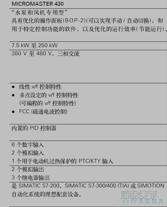 MICROMASTER 430 變頻器適合用于各種變頻驅動裝置,由于其靈活性而可以在廣泛的領域得到應用。這種變頻器尤其適合用于工業部門的水泵和風機。變頻器的特點是設備性能面向客戶的需求,而且使用簡便。與MICROMASTER 420 變頻器相比,這種變頻器具有更多的輸入和輸出端,還具有經過優化的后手動/自動切換功能的操作面板,以及自適應功能的軟件。