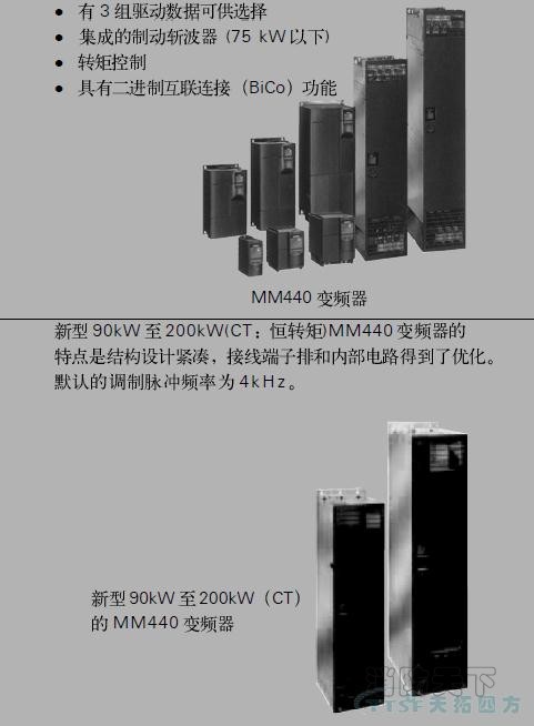MICROMASTER 440 是用于控制三相交流電動機速度的變頻器系列本系列有多種型號額定功率范圍從120W 到200kW ,恒定轉矩CT 控制方式或者可達250kW 可變轉矩VT控制方式供用戶選用。