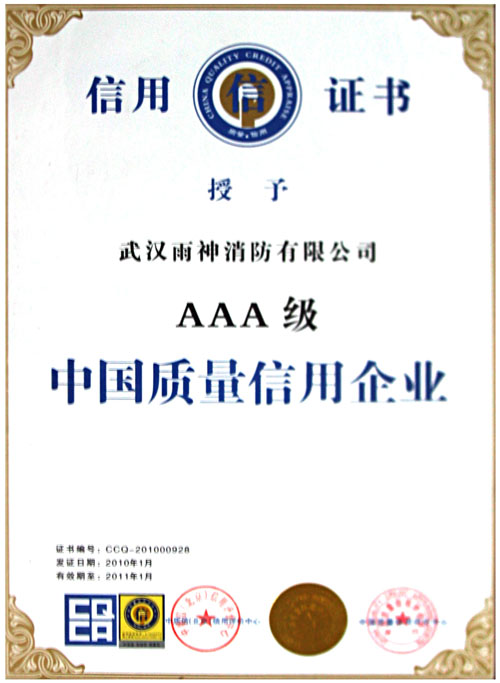 2010年3月,武漢雨神消防有限公司在企業信用及產品質量嚴格審核的角逐中獲高度認可,中質信(北京)信用評價中心授予我公司“AAA級質量信用企業”稱號。