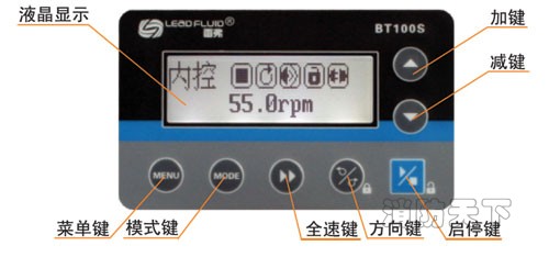 BT100S調(diào)速型蠕動泵流量范圍0.00011~720毫升/分鐘;工作轉(zhuǎn)速0.1-150轉(zhuǎn)/分鐘;專用的LF-LCD-OS軟件系統(tǒng),中英文顯示,簡單方便;具有轉(zhuǎn)速調(diào)節(jié),正反,啟停,全速(清洗)等基本功能;專用的“簡易分裝鍵”,功能強(qiáng)大,可實(shí)現(xiàn)定時定量,連續(xù)分裝,流量測試等功能。