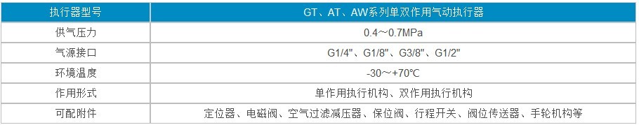 采用新型氣動執(zhí)行器,有雙作用式和單作用式(彈簧復(fù)位),齒輪齒條傳動,安全可靠;大口徑閥門采用系列AW型氣動執(zhí)行器拔叉式傳動,結(jié)構(gòu)合理,輸出力大,有雙作用式和單作用式。
