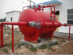 壓力式泡沫比例混合裝置主要有罐體、膠囊、比例混合器、進水管路、出液管、排水閥、排污閥、安全閥、壓力表組成。每個管路均安裝有閥門、進水管線上裝有壓力表,膠囊裝在罐體內,其內腔和罐腔是各自獨立的。它是用來儲存泡沫滅火劑,并通過壓力式比例混合器的作用,將消防供水置換裝置內儲存的泡沫滅火劑,并與供水按一定的比例混合形成泡沫混合液的裝置。按儲罐的結構形式分為:臥式比例混合裝置和立式比例混合裝置;按比例混合器的個數分為:單比例混合器混合裝置和多比例混合器(2只或是4只)混合裝置。