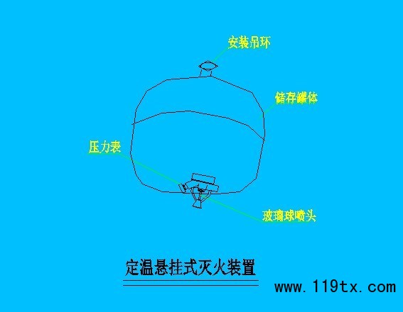 (1)定溫懸掛式滅火系統(tǒng)。不用安裝自動(dòng)報(bào)警控制系統(tǒng),當(dāng)室內(nèi)溫度到達(dá)68℃時(shí),感溫元件自動(dòng)爆破,滅火劑自動(dòng)噴放到防護(hù)區(qū)實(shí)施滅火。