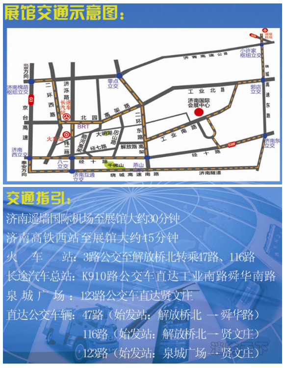 濟南國際會展中心坐落在歷史文化名城濟南的市區東部—國家級濟南高新技術產業開發區最具現代化、最具聚集力的中心商務地帶。南臨市區主干道工業南路,東連與濟青、京福高速公路相通的繞城高速公路,西接中心城區二環東路。地理位置優越,交通便捷通暢。建筑雄偉、設施先進、配套齊全,其規模化、現代化和專業化在中國內會展場館中位居前列。