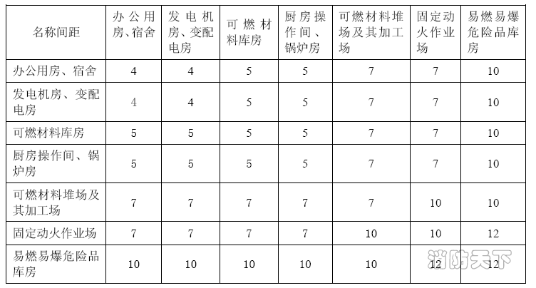 3.2.1 易燃易爆危險品庫房與在建工程的防火間距不應小于15m,可燃材料堆場及其加工場、固定動火作業場與在建工程的防火間距不應小于10m,其它臨時用房、臨時設施與在建工程的防火間距不應小于6m。