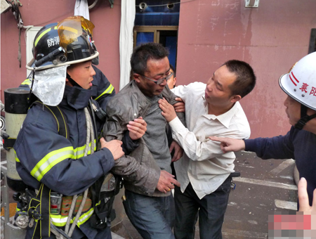 4月14日,消防隊員從失火的酒店救出受傷人員。