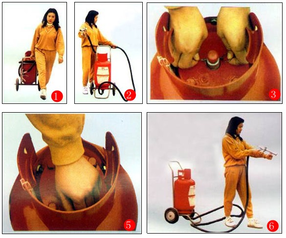 ⑤左手把持噴粉槍管托,右手把持槍把用手指扳動噴粉開關,對準火焰噴射,不斷靠前左右擺動噴粉槍,把干粉籠罩住燃燒區(qū),直至把火撲滅為止。