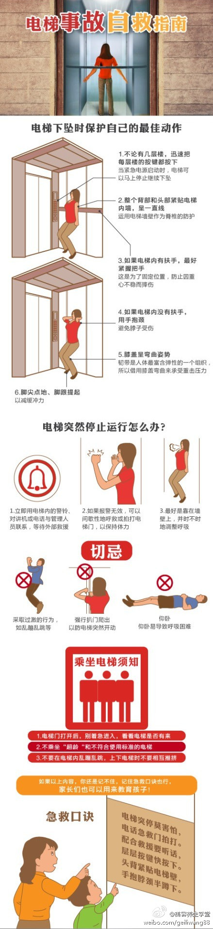 電梯發(fā)生事故時,該如何做才能保證自己受到最輕的傷害?一張圖教你如何在發(fā)生電梯事故時自救,一定要仔細(xì)看記在心里哦。
