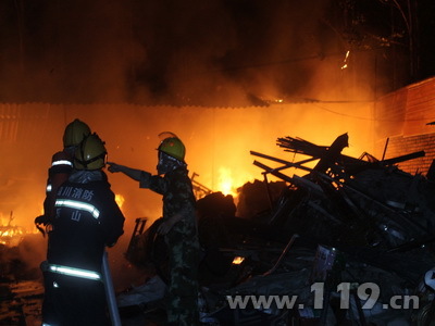 夾江大隊(duì)接警后迅速出動(dòng)3臺(tái)消防車、12名官兵趕赴火災(zāi)現(xiàn)場(chǎng)進(jìn)行滅火,在快到達(dá)現(xiàn)場(chǎng)的路段就能看見大火已經(jīng)染紅了整個(gè)天空,見此情況中隊(duì)迅速調(diào)集轄區(qū)力量7102油庫(kù)專職消防隊(duì)員進(jìn)行增援。到場(chǎng)后中隊(duì)官兵迅速出兩支水槍進(jìn)行滅火,一支水槍殲滅火勢(shì)一支水槍防止蔓延;經(jīng)過(guò)40多分鐘的不懈戰(zhàn)斗,明火基本被撲滅,但是由于回收站到處堆放的是紙板塑料袋和很多易燃的雜物,為避免火災(zāi)發(fā)生復(fù)燃,中隊(duì)官兵對(duì)火災(zāi)現(xiàn)場(chǎng)進(jìn)行了仔細(xì)的清理,確定無(wú)復(fù)燃的情況發(fā)生后,中隊(duì)官兵清點(diǎn)好人員和器材返回了中隊(duì)。