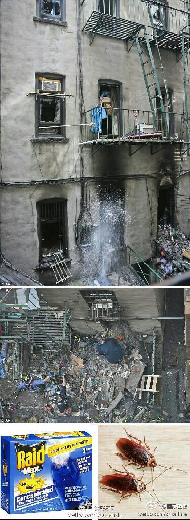 【為滅蟑螂引發的火災】英國每日郵報報道,居住在紐約中國城的一位婦女日前為滅掉家里的蟑螂,噴了大量殺蟲劑。但她沒有關閉家里的烤箱,結果24罐殺蟲劑被引爆,引發火災。火災讓她居住的建筑部分坍塌,還造成15人受傷,其中3人傷勢嚴重。