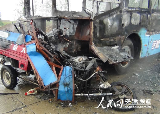 9月10日下午2時許,淮南市田家庵區206國道三和鄉往合肥方向路段發生一起交通事故,三輪車與公交車相撞,引發火災,造成1人死亡2人輕傷。