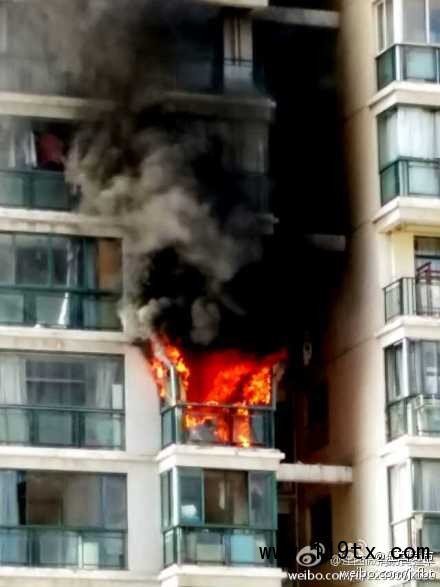 現(xiàn)場濃煙滾滾,大火撲出陽臺,直往上竄。