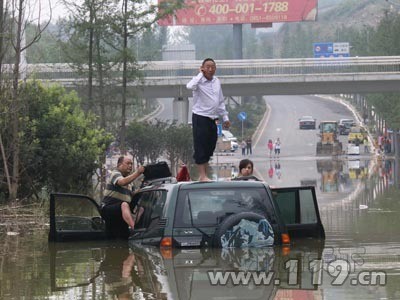 經(jīng)偵查發(fā)現(xiàn),水淹越野車過半,越野車距離安全地點約有100米,3人被困。
