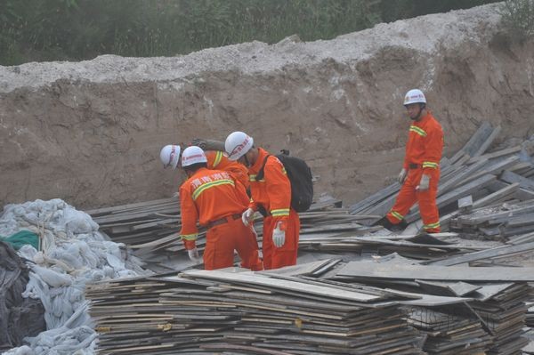 模擬訓練在消防中隊營地附件的建筑工地里進行,“地震”發(fā)生后,中隊重型救援隊立即趕往現(xiàn)場。到達現(xiàn)場后,對現(xiàn)場進行封控,警戒組攜帶警戒桶、警戒帶以及指示牌等器材,對現(xiàn)場進行警戒,清理現(xiàn)場無關人員,并劃分出入口道路、緊急集合區(qū)、醫(yī)療援助區(qū)、人員集散區(qū)、器材裝備集散區(qū)。隨后,中隊搜救組劃定搜索區(qū)域,分組進行搜索。首先進行表層人工搜索,偵檢組7人組成一列橫隊,由指揮員利用哨子和紅綠旗子進行指揮,通過看、喊、敲等方式進行表面搜索。在不能完全確定的情況下,使用雷達生命探測儀、蛇眼探測儀和熱成像儀進行深層搜救。被困人員被確定后,利用紅旗進行標記。在確定被困人員的位置后,指揮員確定進行作業(yè)的人員和裝備,然后由指揮員統(tǒng)一組織施救,利用支撐技術、頂撐技術和破拆技術打開營救通道。營救組成員攜帶多功能救援擔架,救生裝備,營救被困人員。人員救出后,由營救組將傷者送往醫(yī)療救護區(qū),交由120處置。