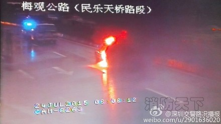 網友消息:今天早上8點左右,深圳梅觀路民樂人行天橋路段南往北方向,兩輛小車發生事故引起著火。