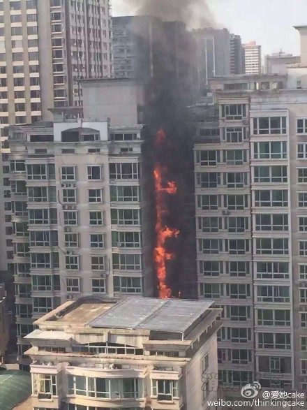 現(xiàn)場(chǎng)火光沖天,沿著外墻不斷往上蔓延,黑煙滾滾。