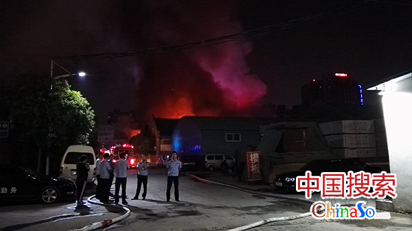 現場濃煙滾滾,火光沖天,蔓延迅速。因為著火的倉庫內有大量木料,所以火勢燃燒的非常旺,不斷的有紅火從倉庫頂上冒出。