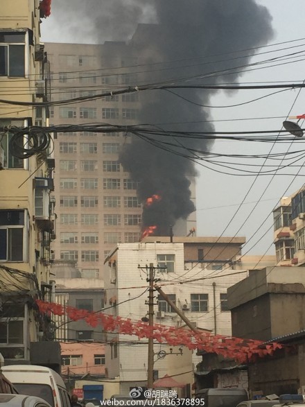 現(xiàn)場黑煙滾滾不斷從頂樓冒出,火光沖天,火勢迅猛。