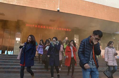 下午15時演練正式開始。當模擬出的橘紅色的滾滾濃煙彌漫整個圖書館時,隨著館內警報聲響起,工作人員立即向學生及工作人員發出緊急撤離的信號。疏散出來的學生用濕毛巾、袖口捂住口鼻,低姿態、緊張有序地模擬現場,到達指定安全地點。隨后立即轉入火災撲救演練,140余名師生在專業人員的指導下,手提滅火器進行了滅火實踐操作。
