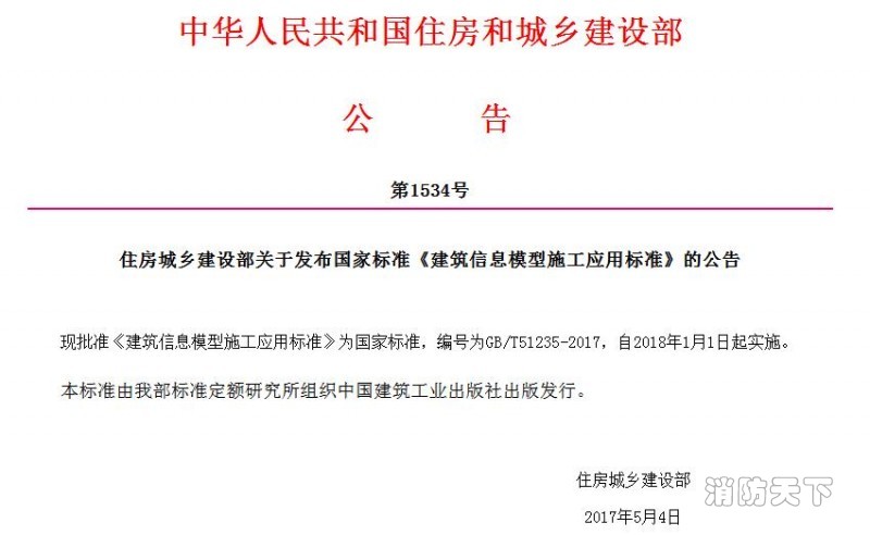 住建部印發國家標準《建筑信息模型施工應用標準》編號為GB/T51235-2017,自2018年1月1日起實施。