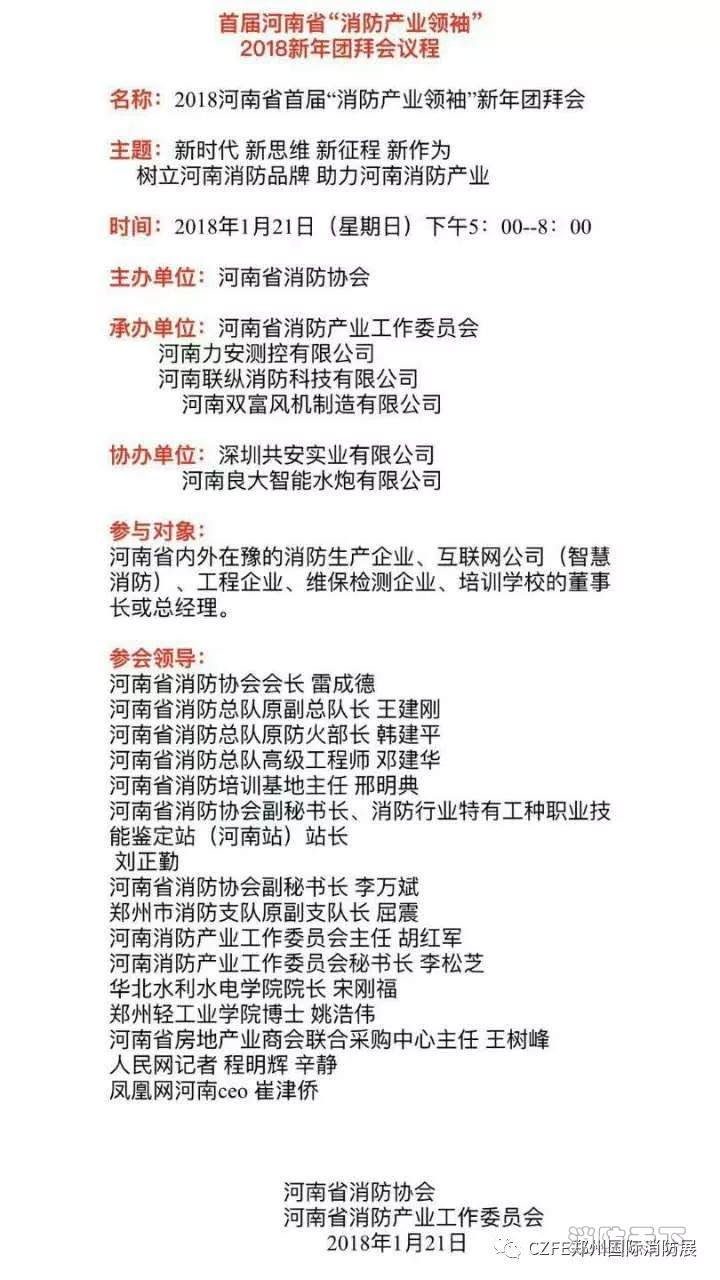 由河南省消防協(xié)會(huì)主辦,河南消防產(chǎn)業(yè)工作委員會(huì)承辦的河南省消防產(chǎn)業(yè)“領(lǐng)袖”2018新年團(tuán)拜會(huì),1月21日下午在鄭州市逸泉國(guó)際酒店隆重舉行。