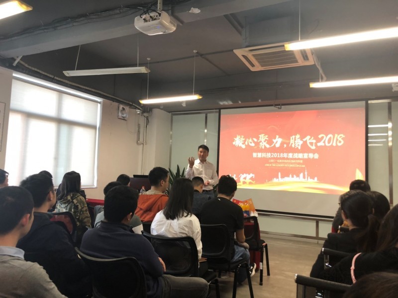 會議由市場部羅敏慧經理主持,以“凝心聚力,騰飛2018”為主題,于9:30分正式拉開帷幕!智慧科技全體部門負責人在此次會議上立下了“軍令狀”,為騰飛2018掌舵護航!