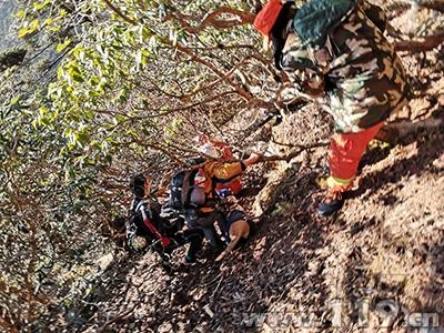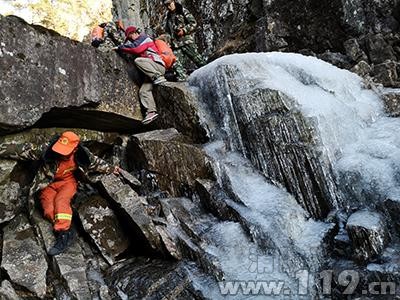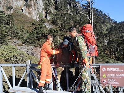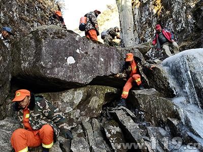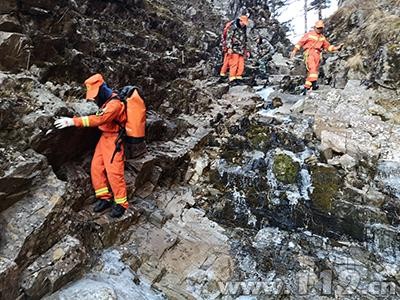 6時許,第二搜救分隊攜帶搜救器材進山,并于6時50分與先行小分隊匯合。指揮員根據現場情況重新研判制定救援方案,第一分隊沿山脊向下搜索,第二小分隊沿峽谷向下搜索,9時15分,第二小分隊在玉局峰南坡的石壁下成功找到兩名被困者,兩人均無大礙。對兩人進行了簡單的護理和補充體力后,9時35分,搜救隊開始轉移被困人員。