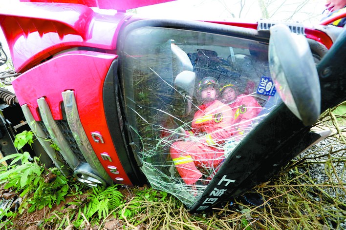 在救援過程中,由于現(xiàn)場(chǎng)救援環(huán)境惡劣,壓住駕駛員的車身笨重,救援難度很大,稍有不慎就會(huì)造成二次事故。消防隊(duì)員在施救時(shí)鉆進(jìn)駕駛室,每一個(gè)救援動(dòng)作都操作得十分小心,隨時(shí)關(guān)注事故車輛的變化,做好防護(hù)措施。