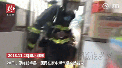 恩施一居民在家中陽臺上用煤氣噴槍燒肉時,不慎將煤氣罐引燃,噴出一米多的火舌。危急時刻,消防員在隊友的水槍掩護(hù)下,徒手將“定時炸彈”從屋內(nèi)拎出,移至空曠地帶,對煤氣罐進(jìn)行冷卻并稀釋泄漏的煤氣,成功化解險情。致敬“抱火哥”!