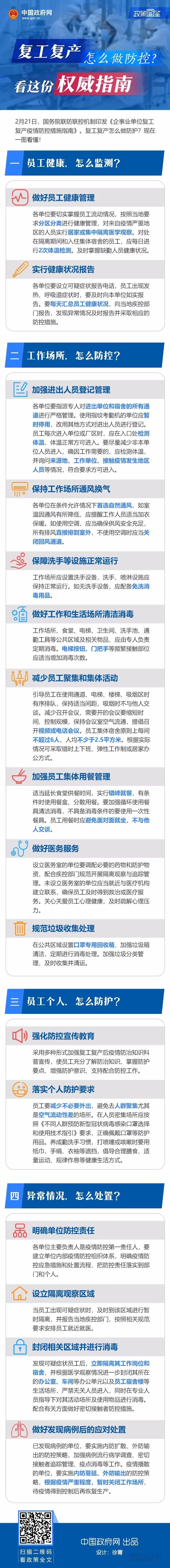 2月21日,國務院聯防聯控機制印發《企事業單位復工復產疫情防控措施指南》,復工復產到底應該怎么做防護?現在一圖看懂!