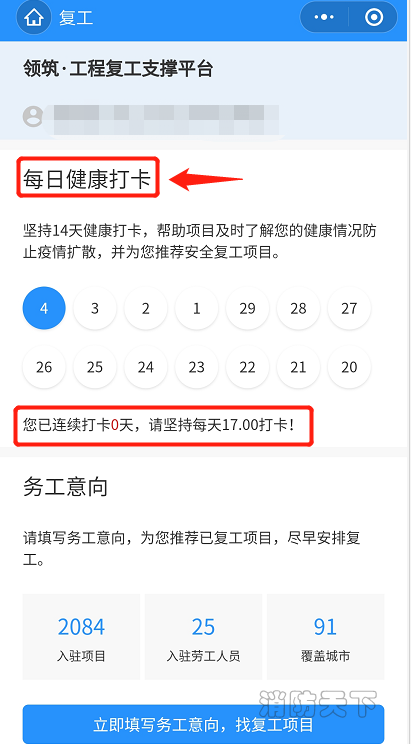 此外,項目管理人員可以把務工人員拉上“復工幫”小程序,利用其中的“每日健康打卡”等功能做好健康監控,幫助項目及時了解,加強項目疫情防控。