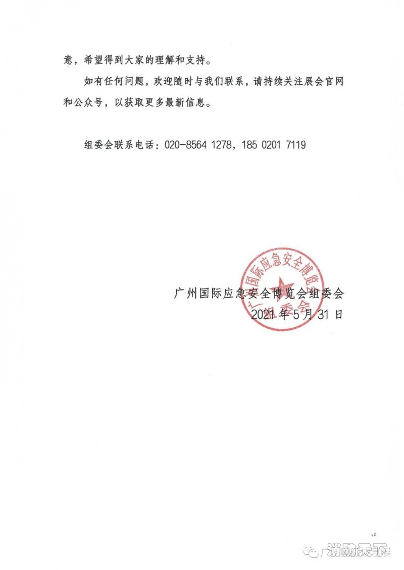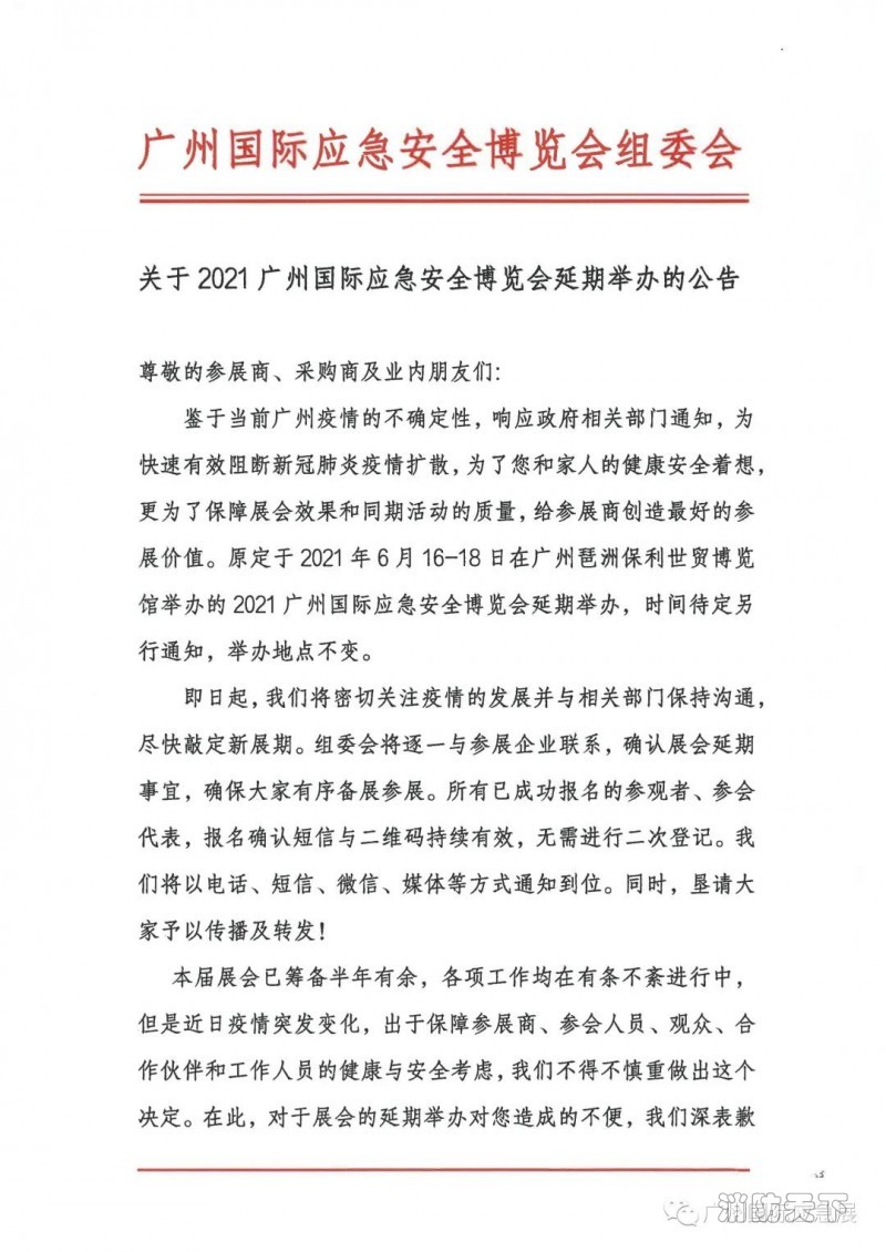 鑒于當(dāng)前廣州疫情的不確定性,響應(yīng)政府相關(guān)部門通知,為快速有效阻斷新冠肺炎疫情擴(kuò)散,為了您和家人的健康安全著想,更為了保障展會效果和同期活動的質(zhì)量,給參展商創(chuàng)造最好的參展價值,原定于2021年6月16-18日在廣州琶洲保利世貿(mào)博覽館舉辦的2021廣州國際應(yīng)急安全博覽會延期舉辦,時間待定另行通知,舉辦地點(diǎn)不變。