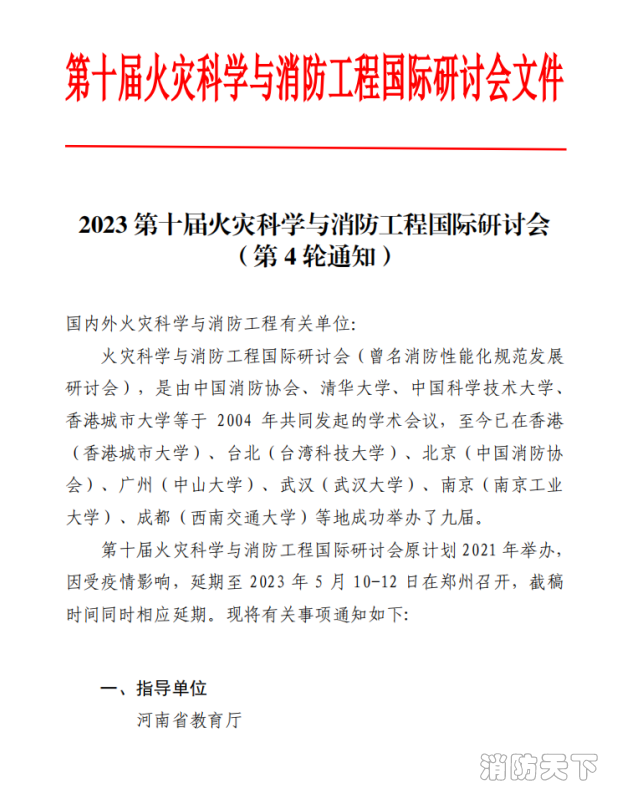 第十屆火災(zāi)科學(xué)與消防工程國際研討會將于2023年5月10日-12日在鄭州國際會展中心(會議中心太室廳)舉辦,會議將在繼承以往會議成果的基礎(chǔ)上,對火災(zāi)科學(xué)與消防工程領(lǐng)域的科研作更深層次的探討和交流,歡迎國內(nèi)外專家學(xué)者積極參會。
