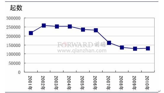 2001-2010年中國火災發展趨勢(單位:起數)