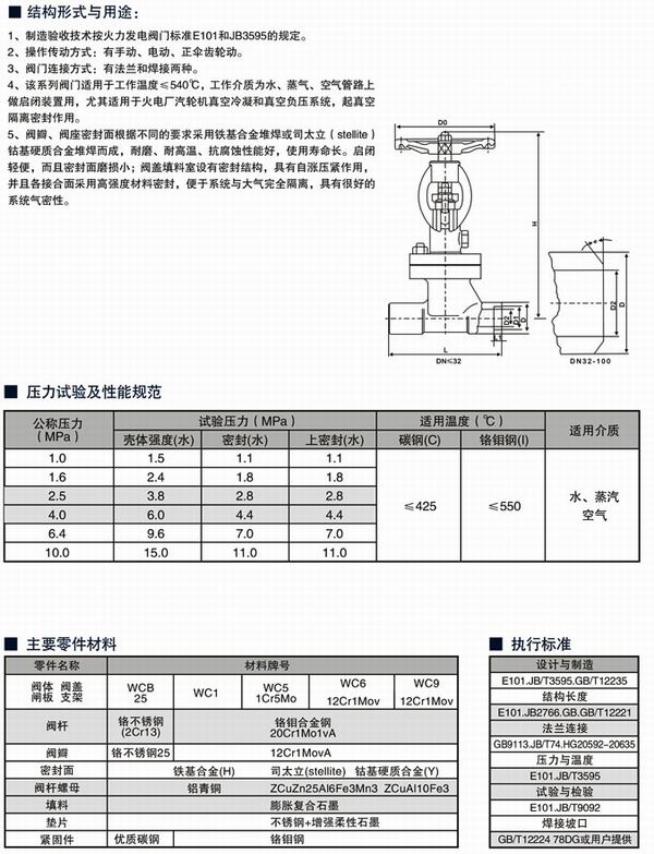 適用于工作溫度≤425℃和≤550℃,工作介質(zhì)為水、蒸汽或空氣的管路上,作為啟閉裝置;