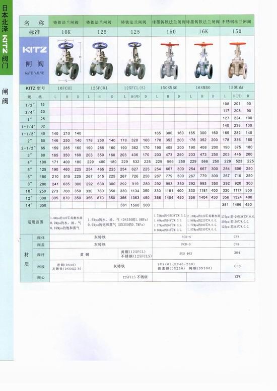 日本北澤KITZ鑄鐵法蘭閘閥:閘閥的啟閉件是閘板,閘板的運動方向與流體方向相垂直,閘閥只能作全開和全關 , 不能作調節和節流。閘板有兩個密封面 , 最常用的模式閘板閥的兩個密封面形成楔形、楔形角隨閥門參數而異 , 通常為 50, 介質溫度不高時為 2°52' 。