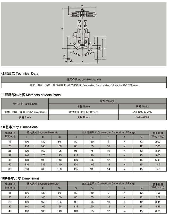 JIS F7301 5K/F7303 16K船用青銅法蘭直通截止閥
