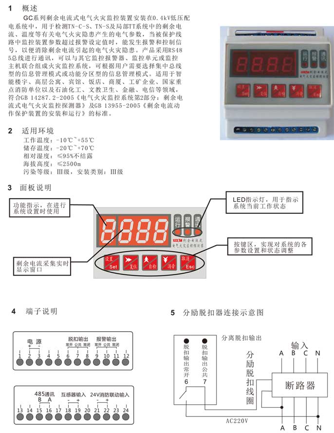 GC系列剩余電流式電氣火災監控裝置安裝在0.4kV低壓配電系統中,用于檢測TN-C-S、TN-S及局部TT系統中的剩余電流、溫度等有關電氣火災隱患產生的電氣參數,當被保護線路監控裝置參數超過報警設定值時,能發生報警和控制信號,以便消除剩余電流引起的電氣火災隱患。產品采用RS485總線進行通訊,可以與其它監控報警器、監控單元或監控主機聯合組成火災監控系統,可根據用戶需要選擇集中總線型的信息管理模式或功能分區型的信息管理模式。適用于智能樓宇、高層公寓、賓館、飯店、商廈、工礦企業、國家重點消防單位以及石油化工、文教衛生、金融、電信等領域,符合GB14287.2-2005《電氣火災監控系統第2部份:剩余電流式電氣火災監控探測器》及GB13955-2005《剩余電流動作保護裝置的安裝和運行》的標準。