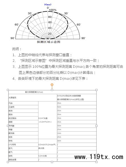2、上圖顯示100%位置為最大探測(cè)距離D(max),各個(gè)角度的探測(cè)距離可由圖上黑色邊緣部分的百分比乘以D(max)計(jì)算得出;