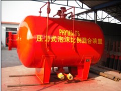 壓力式泡沫比例混合裝置主要有罐體、膠囊、比例混合器、進水管路、出液管、排水閥、排污閥、安全閥、壓力表組成。每個管路均安裝有閥門、進水管線上裝有壓力表,膠囊裝在罐體內,其內腔和罐腔是各自獨立的。它是用來儲存泡沫滅火劑,并通過壓力式比例混合器的作用,將消防供水置換裝置內儲存的泡沫滅火劑,并與供水按一定的比例混合形成泡沫混合液的裝置。按儲罐的結構形式分為:臥式比例混合裝置和立式比例混合裝置;按比例混合器的個數分為:單比例混合器混合裝置和多比例混合器(2只或是4只)混合裝置。
